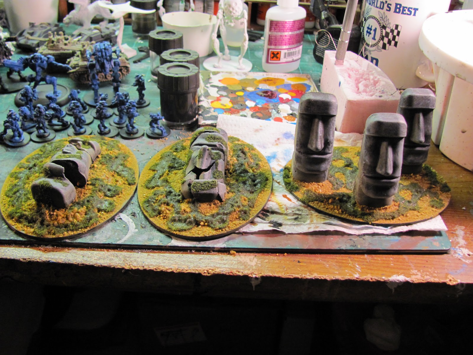 Some Easter Island head Terrain from Wind Sword I bought At Fall In. I did not realize till I got them home they were just plaster so I has to base them all to ensure they would not break. In the background is the legion of robots to paint. 🙂